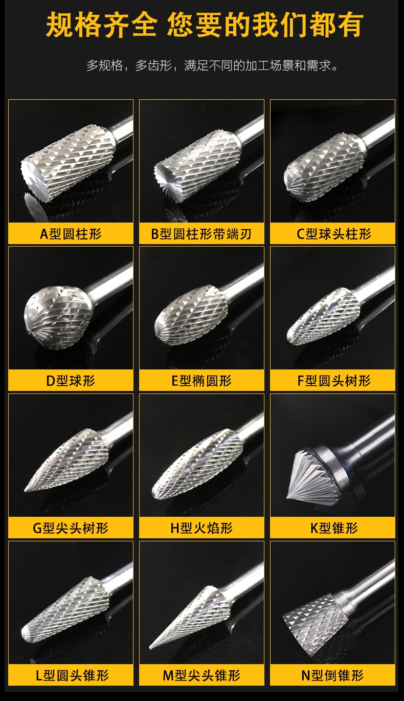 硬質(zhì)合金旋轉(zhuǎn)銼,亦稱硬質(zhì)合金高速什錦銑刀、硬質(zhì)合金模具銑刀等,與高速電磨機或風動工具配套使用。硬質(zhì)合金旋轉(zhuǎn)銼優(yōu)點